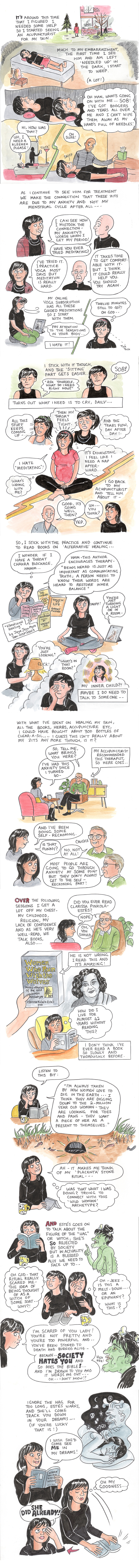 According to journalistic science, women are likelier to go though a midlife crisis earlier than men, between the ages of 35-44. Well my midlife crisis certainly showed up on schedule, as this comic details. I discovered that you don’t learn to be a whole human being all by yourself, you need to ask for help. I’m still learning, it being a process, not a destination, as they say.