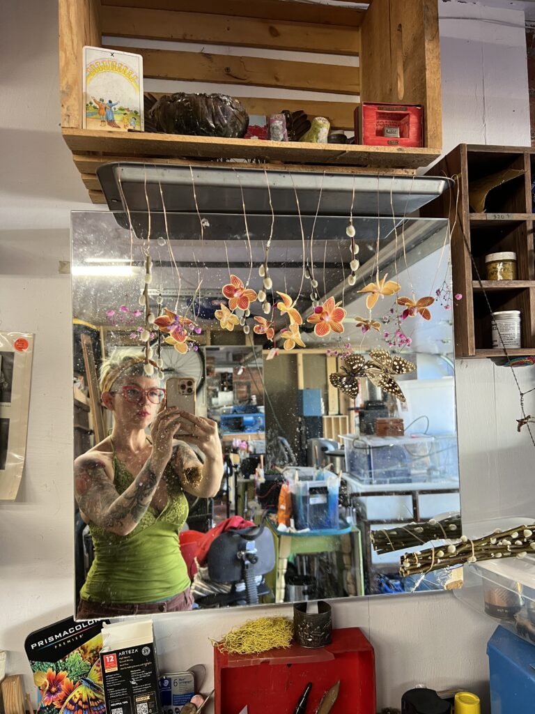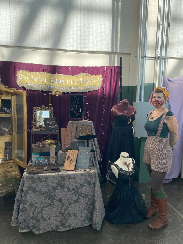 I must stay open to strangers so I can sell something, but with every interaction, my body constricts a little more. I think about all the crappy jewelry people make that sells out within minutes of them posting it on Instagram, and I think about how I’ve poured my root forces into this work and am now begging for someone to put a nickel into my mouth. I bite the inside of my cheeks until I can taste metal and look up to comments of slowed passersby.
